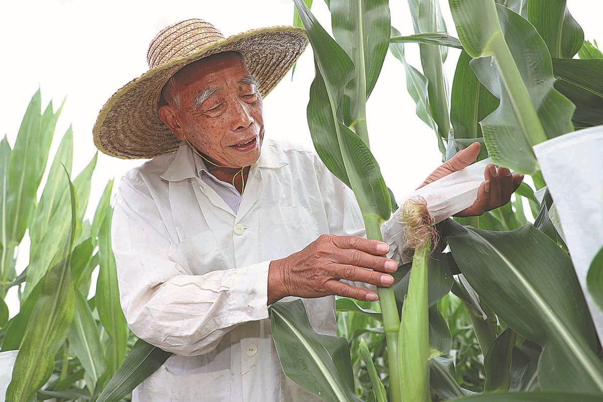 Agricultural scientist Cheng Xiangwen, 86, works in cornfields at a Nanfan base in Sanya, Hainan province. LI XUESHI/MA ZHENGHUI/FOR CHINA DAILY