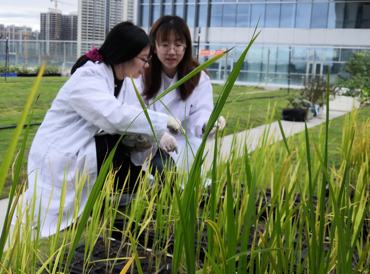 Technicians check rice grown on the roof of a seed laboratory at Yazhou Bay Science and Technology City, Sanya. MA ZHIPING/CHINA DAILY