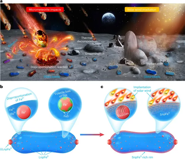 Furthermore, by integrating knowledge from astronomy, space science, and other disciplines, the study revealed that large and small-sized nano-iron particles with distinct spectral modification effects have independent formation mechanisms, corresponding respectively to (micro)meteorite impacts and solar wind irradiation on the lunar surface.