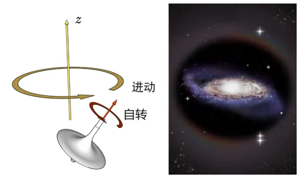 Left image: A spinning top undergoes precession under the torque of gravity; Right image: Analogously, the warped silver disk "dances (precesses)" under the torque of the dark matter halo (an artistic rendering by Shanghai Jiao Tong University)