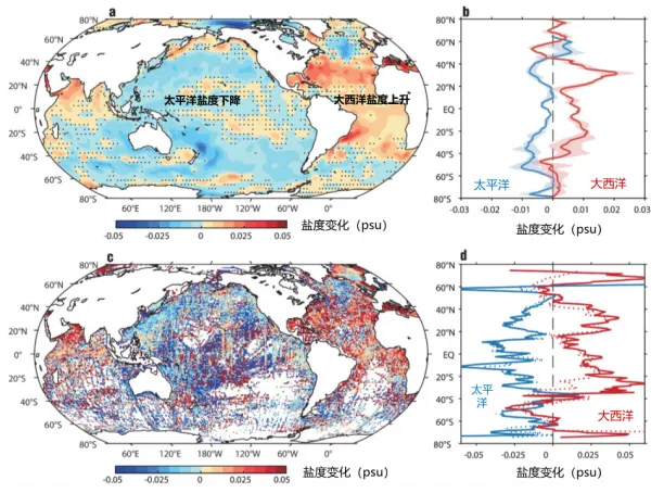 Recently, WANG Fan's team at the Institute of Oceanography of the Chinese Academy of Sciences, in conjunction with the Institute of Atmospheric Physics (IAP), has analyzed the oceanic 0-2000-meter observational data and revealed a strengthening trend of the Atlantic–Pacific salinity contrast (APSC) over the past half century (since 1965), i.e., an overall increase in Atlantic salinity and a general decrease in Pacific salinity.