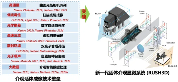 Against this background, the research team of DAI Qionghai at Tsinghua University developed the RUSH3D mesoscopic in vivo microscope to fill this technology gap. The system not only has a 3D field of view at the centimeter level, but also attains sub-cellular-level resolution. It allows for continuous high-speed and low-phototoxicity observation for tens of hours, which completely transforms the way we perceive the dynamic interactions of cells. For the first time, RUSH3D enables scientists to capture tissue heterogeneity with cellular precision across the scale of living mammalian organs in a panoramic manner, opening up new prospects in research fields such as brain science and oncology. RUSH3D creates new opportunities for research in brain science, oncology and other fields.