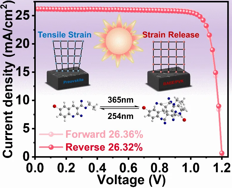 The group also put forward molecularly-induced strain modulation and interfacial passivation strategies for enhancing the efficiency and photostability of chalcogenide solar cells. In this study, the cycloaddition reaction of 6-bromocoumarin-3-carboxylic acid ethyl ester (BAEE) is utilized to consume ultraviolet light, thereby suppressing the residual tensile stress of the film. At the same time, BAEE can form a bond with nickel oxide to promote the growth of chalcogenide and passivate interfacial defects. As a result, a certified efficiency of 26.08% and an open - circuit voltage of 1.201V are obtained. This reduces the open - circuit voltage loss and improves the long - term stability of the device, providing a new strategy for enhancing the efficiency and stability of chalcogenide photovoltaic conversion devices.