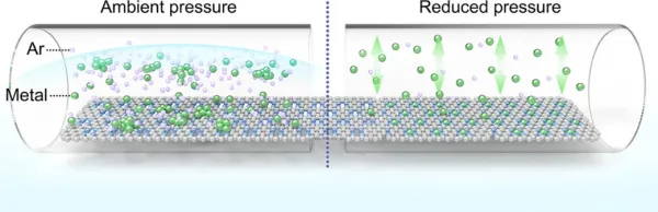 The study discloses the mechanism through which alterations in air pressure regulate the formation of monometallic atoms and clusters by means of molecular dynamics and computational fluid dynamics simulations: By decreasing the air pressure to increase the mean free path of gas molecules, the probability of metal clustering is reduced, the probability of metal-ligand binding is increased, and the formation of monometallic atoms is promoted.