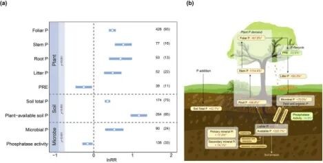 Researchers from the Institute of Botany, Chinese Academy of Sciences, constructed a global database compiling 1,315 observations from 176 published studies, covering 159 natural terrestrial ecosystems worldwide. The study found that phosphorus addition significantly increases phosphorus concentrations in various plant tissues, litter, soil, and microorganisms. Concurrently, it reduces the phosphorus resorption efficiency of plant leaves and suppresses soil phosphatase activity, indicating a mitigation of ecosystem phosphorus limitation and a shift in phosphorus acquisition strategy from recycling to active uptake. Furthermore, the sensitivity of different phosphorus cycle components to phosphorus addition varies, with divergent responses across climatic zones. Some indicators in tropical regions exhibit higher sensitivity, a difference primarily regulated by background nutrient levels, climate, and fertilization regimes.