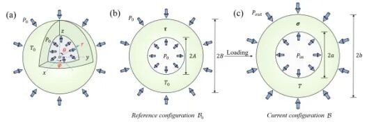 Researchers from the Institute of Mechanics, Chinese Academy of Sciences, have derived an analytical solution for the thermo-mechanically coupled deformation of pressurized spherical shells with initial stress, based on invariant theory. This solution characterizes the coupled feedback relationship between temperature, pressure, and structural deformation of the shell. Validated through multi-dimensional comparisons with finite element simulations and experimental results on shale pore evolution, this theoretical solution accurately describes the evolution of shale pores under compression and thermal effects. Using this model, the team analyzed the mechanical responses under three typical working conditions, clarified the competitive mechanisms between thermal expansion and pressure constraints, and revealed the influence of initial stress on shell deformation, critical pressure thresholds, and stress distribution. The findings demonstrate that deformation and stress within the spherical shell can be controlled through parameter adjustments.
