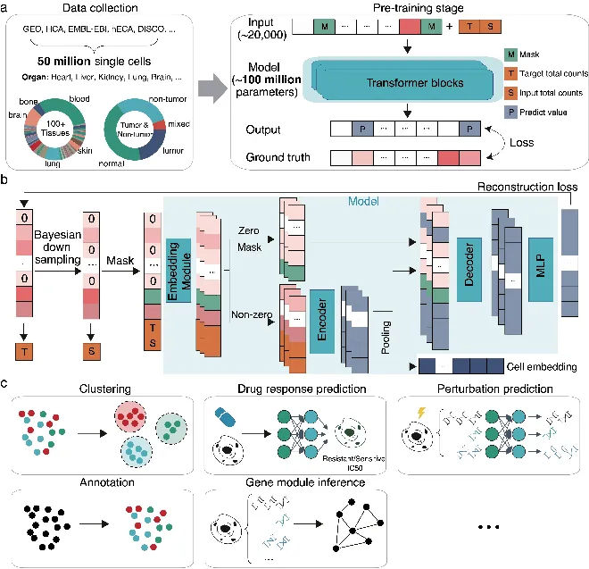 The researchers from the Department of Automation, the Department of Electronic Engineering of Tsinghua University, and BioMap developed a large pretrained model scFoundation, also named ‘xTrimoscFoundationα’, with 100 million parameters covering about 20,000 genes, pretrained on over 50 million human single-cell transcriptomic profiles. As a base model, it has demonstrated excellent performance enhancement in a variety of biomedical downstream tasks such as "virtual drug trials", providing a new paradigm for AI in single-cell research.