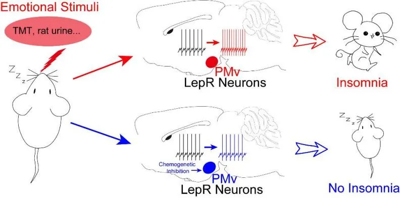Neural mechanisms of emotional insomnia. Administration of different emotional stimuli to mice activates PMvLepR neurons and causes increased arousal; chemogenetic inhibition of PMvLepR neurons eliminates the elevated arousal induced by emotional stimuli.