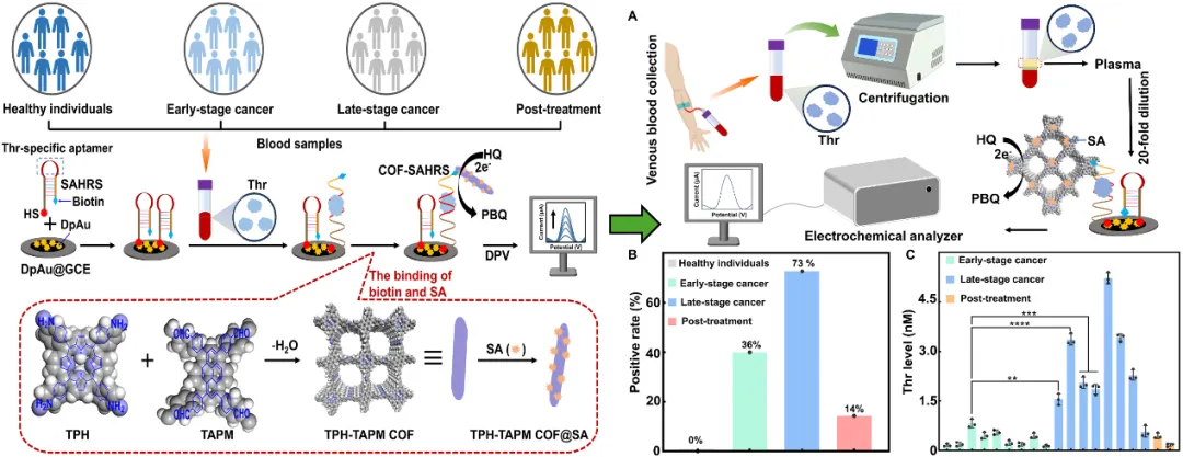 Under optimal conditions, the COF-SAHRS sensor exhibits a low detection limit of 0.17 pM and a linear range from 10 pM to 20 nM. In a thrombin spiked recovery experiment, the recovery rate ranged from 95.4% to 104.8%, validating the accuracy of this analytical method. Analysis of blood samples from 50 cancer patients showed that the thrombin levels in advanced cancer patients were significantly higher than those in early-stage cancer patients, indicating that the developed electrochemical aptamer sensor provides a feasible diagnostic tool for detecting cancer and related protein biomarkers in clinical research.