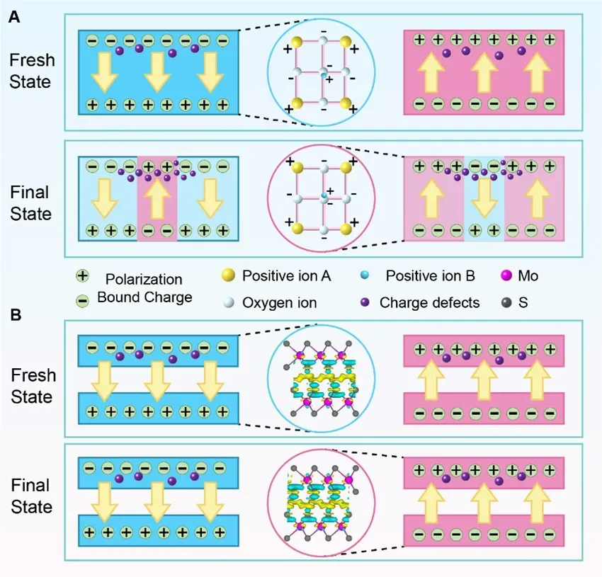 This phenomenon arises because, when the ferroelectric material undergoes cyclic loading in an external field, the electrodeposition flip is invariably accompanied by the migration of defect charges. Over time, these defects coalesce into clusters under sustained exposure to the external field. These defect clusters exert a potent pinning effect on the ferroelectric domains, significantly curtailing their mobility. Once the domain boundaries become pinned, the polarization becomes resistant to flipping, ultimately culminating in the fatigue failure of the ferroelectric device. Despite the fact that this issue was identified and documented as far back as 1953, a comprehensive solution has yet to be achieved.