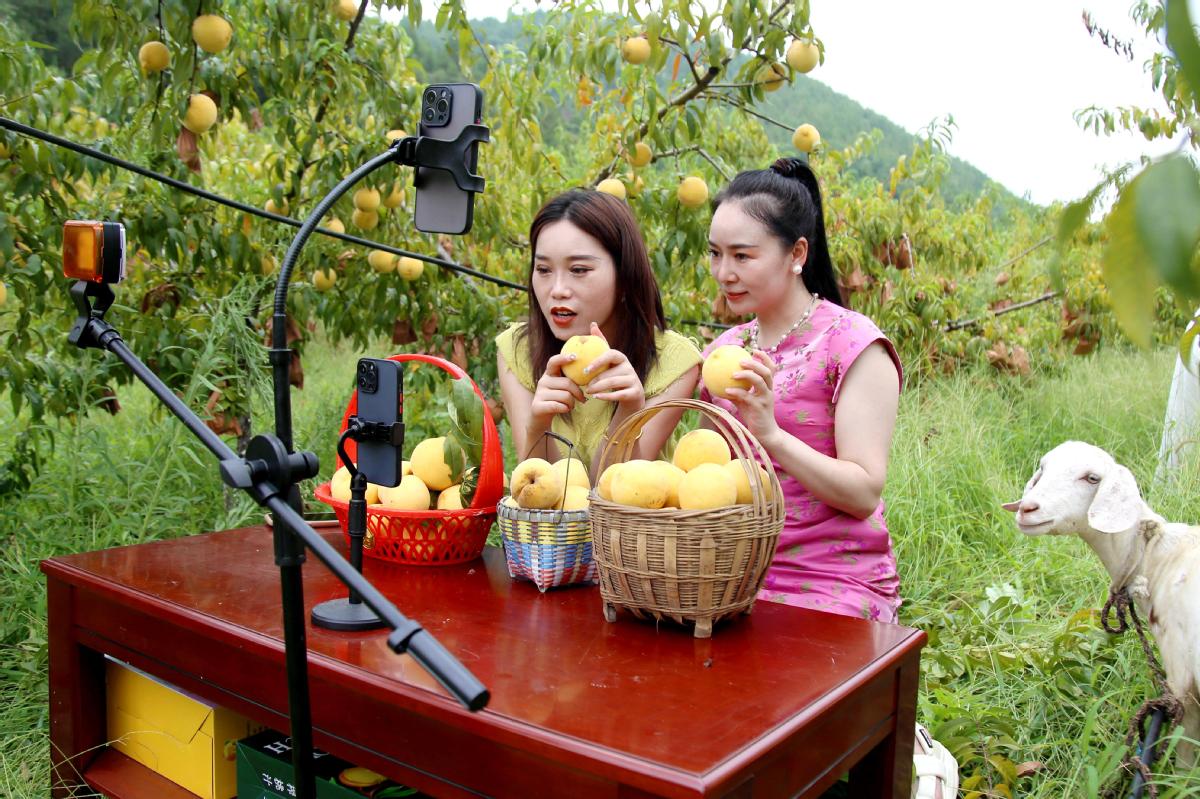 Sellers promote freshly picked peaches via livestreaming at a plantation in Shiyan, Hubei province, in August. CAO ZHONGHONG/FOR CHINA DAILY