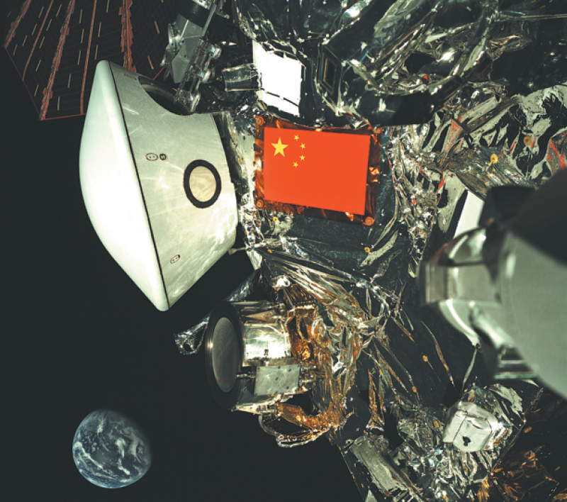 An image taken by China's Tianwen 2 asteroid sampling spacecraft's monitor camera, shows Earth, the probe's white-colored return capsule and a national flag. XINHUA