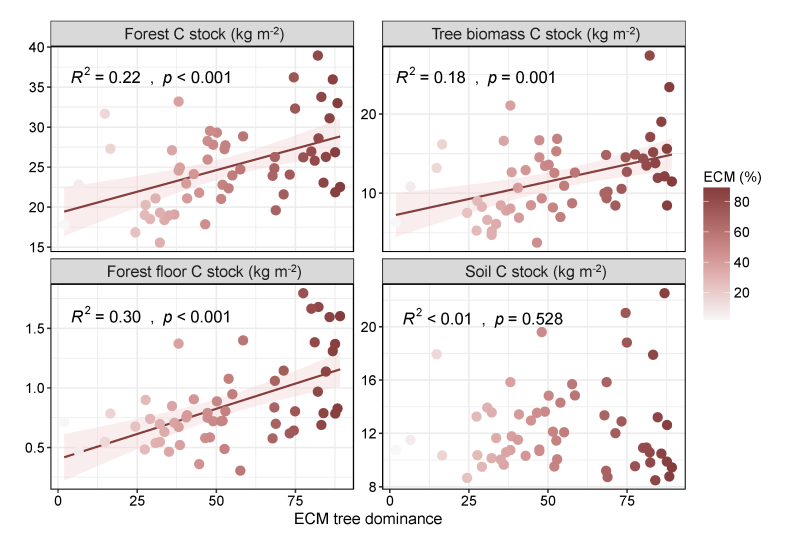 Along a gradient of ectomycorrhizal (ECM) tree dominance, the researchers established 58 sampling plots to assess the impact of ECM dominance on forest carbon stocks. These stocks include three key components: tree biomass carbon, forest floor carbon, and soil carbon.