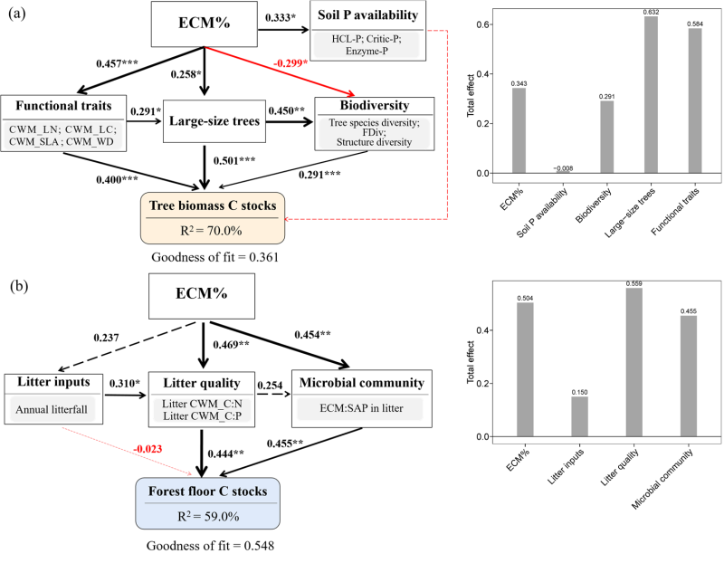 Further analysis identified the drivers behind these patterns. The increase in tree biomass carbon was primarily linked to the higher density of large-size trees in stands dominated by ECM species. Meanwhile, the accumulation of forest floor carbon was mainly attributed to the lower litter quality of ECM trees—characterized by a higher carbon-to-nitrogen (C:N) ratio, which slows down decomposition.