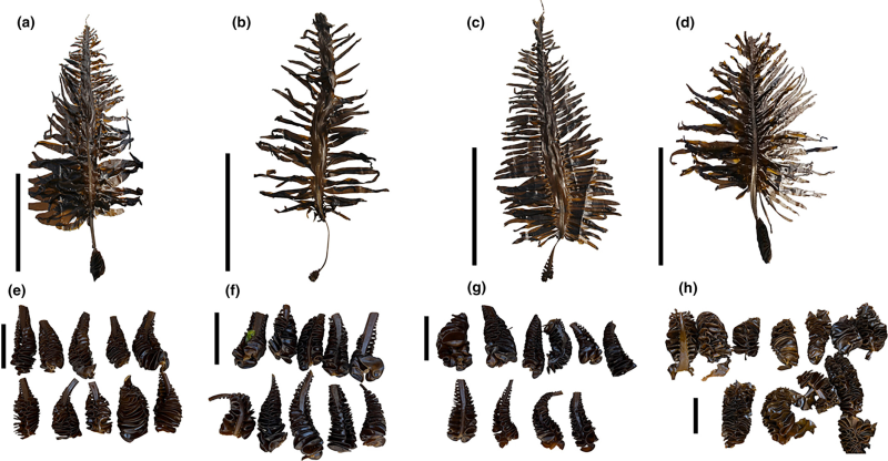 Triploid sporophytes of Undaria pinnatifida (a,b,c) and their sporophylls (e,f,g) and their diploid counterparts (d, h). (Image by IOCAS)