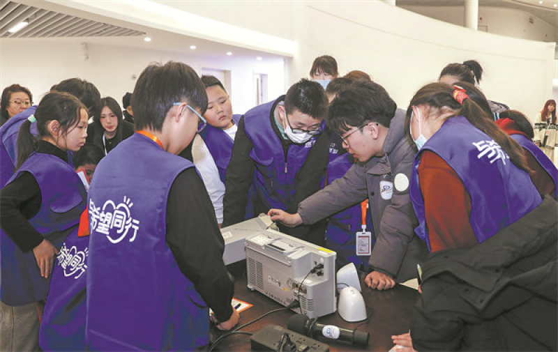 Liang Chongyang (second from right) serves as a volunteer docent to visiting students about the high-energy synchrotron radiation light source facility in Beijing's Huairou district in 2024. (Photo provided to China Daily)